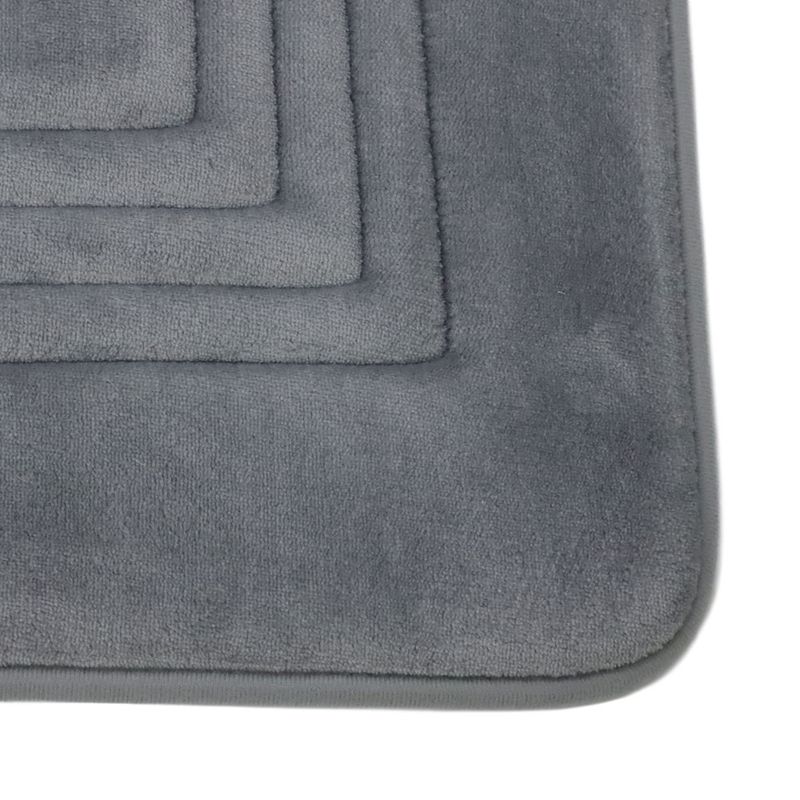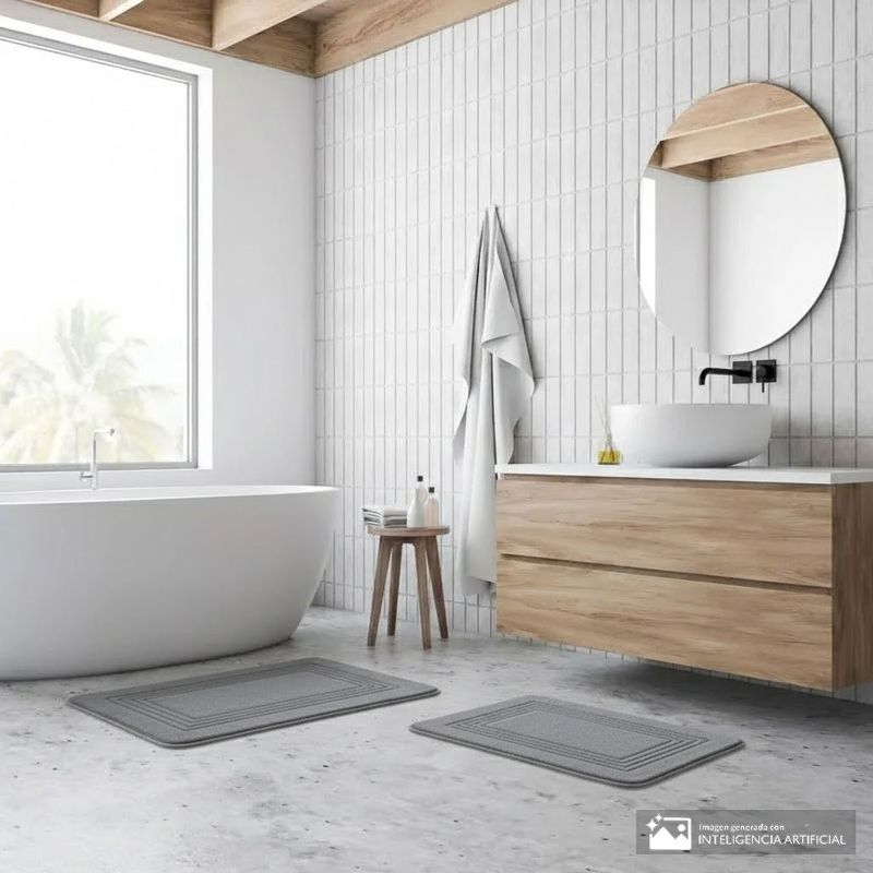 Set de dos alfombras para baño fabricadas en espuma viscoelástica, diseñadas para ofrecer una superficie suave al tacto y de apoyo cómodo. Cada pieza incorpora infusión de carbón, lo que contribuye a propiedades antibacterianas y ayuda a controlar olores. Las alfombras miden aproximadamente 44 cm y 54 cm, adecuadas para colocar frente al lavabo, ducha o inodoro.
