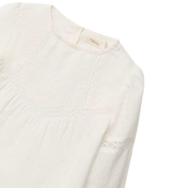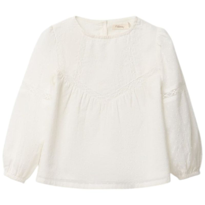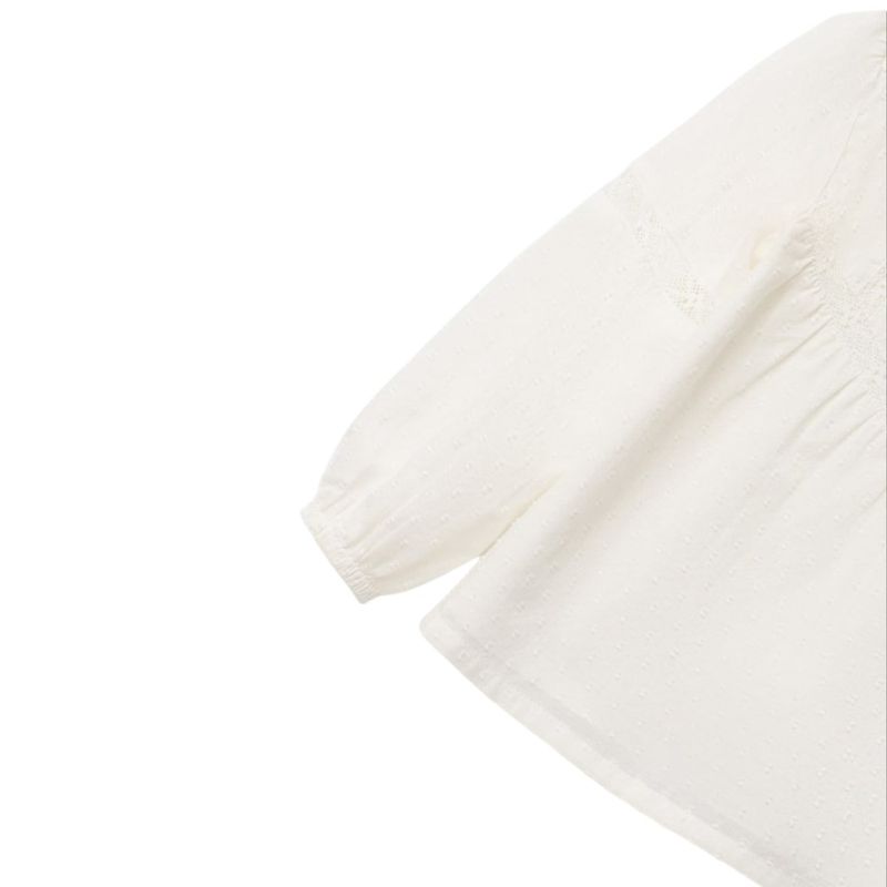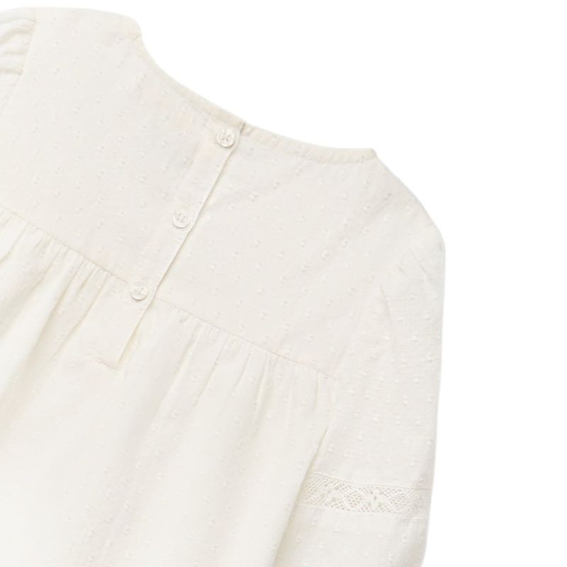 Blusa para niña en color blanco, confeccionada en tejido ligero de algodón con textura. Presenta delicados detalles de encaje en el pecho y las mangas, que aportan un toque romántico y elegante. Su diseño incluye mangas largas abullonadas con puños elásticos y cierre con botón en la parte posterior para facilitar el ajuste. Es una prenda ideal para ocasiones especiales o para dar un aire clásico y refinado a un look casual.
