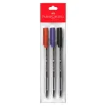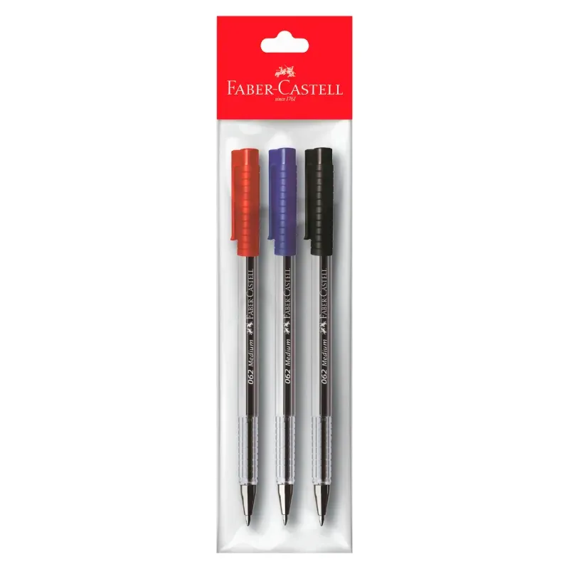 Set multicolor de bolígrafos Faber-Castell ideal para uso escolar, universitario y de oficina. Incluye tres bolígrafos con tinta de colores negro, azul y rojo, perfectos para escritura diaria, toma de apuntes y organización de documentos. Su diseño ergonómico con cuerpo transparente permite un agarre cómodo y un mejor control durante el uso prolongado. La punta media garantiza un trazo uniforme, fluido y legible, brindando una experiencia de escritura suave y constante. Presentación práctica en empaque tipo blíster, ideal para mantenerlos protegidos y organizados en mochilas, escritorios o estuches.