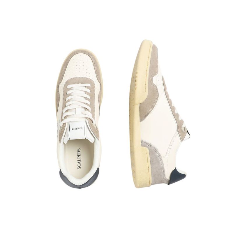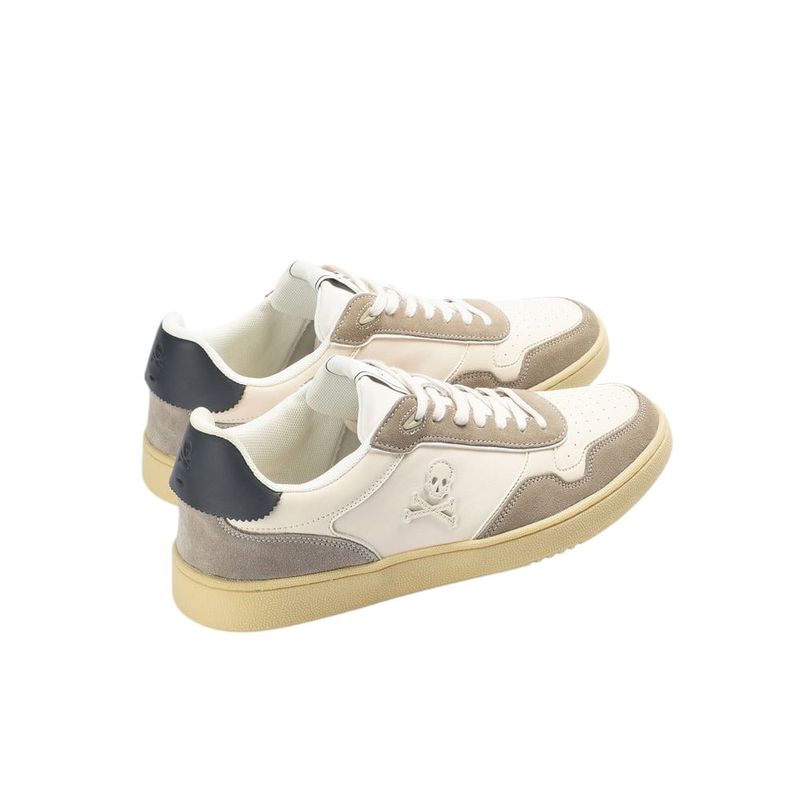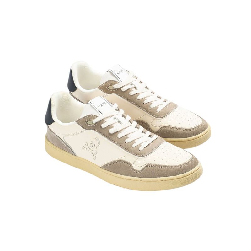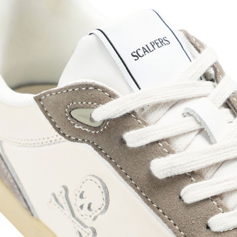 Estos sneakers de Scalpers combinan diseño contemporáneo y materiales de alta calidad. Confeccionados en piel blanca, destacan por su icónico detalle de calavera lateral en contraste y aplicaciones de gamuza beige que aportan un toque distintivo. La puntera presenta micro perforaciones que mejoran la transpirabilidad, mientras que el cierre con cordones garantiza un ajuste firme y cómodo.