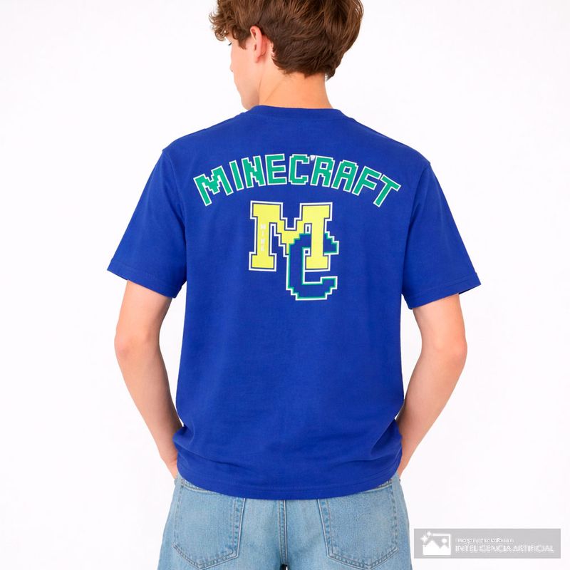 En la parte frontal presenta estampados pequeños tipo insignias con elementos del videojuego, mientras que en la parte posterior destaca un gráfico grande con la palabra “Minecraft” y letras estilizadas en contraste, aportando un efecto visual llamativo. Su diseño de corte recto ofrece una caída cómoda que permite libertad de movimiento.