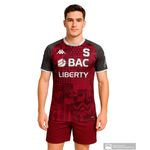 Camiseta deportiva edición jugador del uniforme de local 2024 del Deportivo Saprissa, confeccionada por Kappa. Su diseño moderno combina el tradicional color morado con mangas gris oscuro y cuello blanco, integrando un patrón gráfico único en el frente que resalta la identidad del equipo. Incorpora el logo de la marca y el escudo de la “S” en vinilo termoaplicado, así como los patrocinadores oficiales en los costados y la espalda. Hecha con tecnología Hidroway que ofrece transpirabilidad y secado rápido, ideal para el alto rendimiento deportivo.