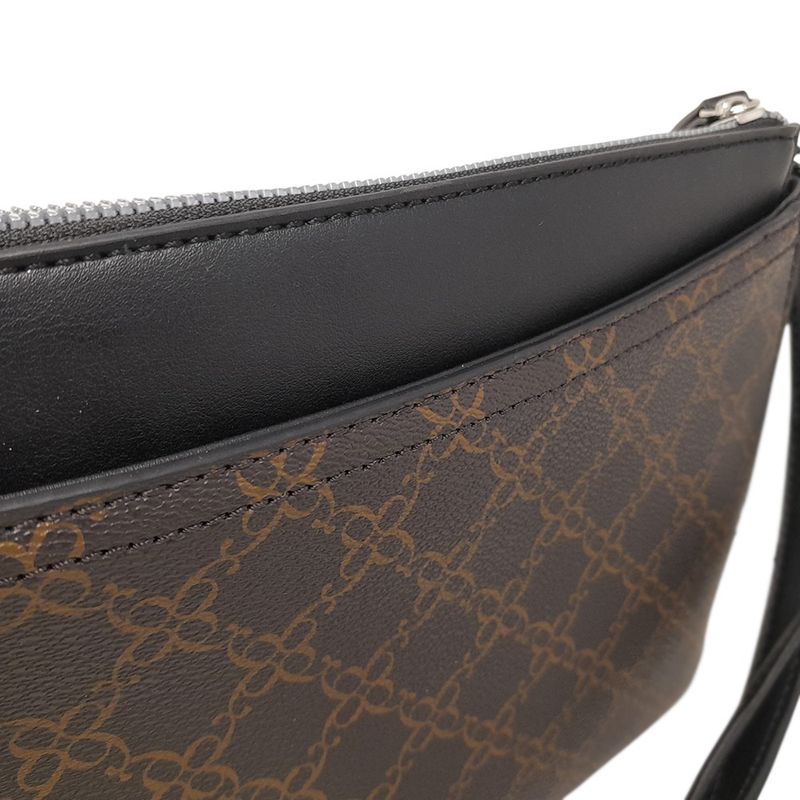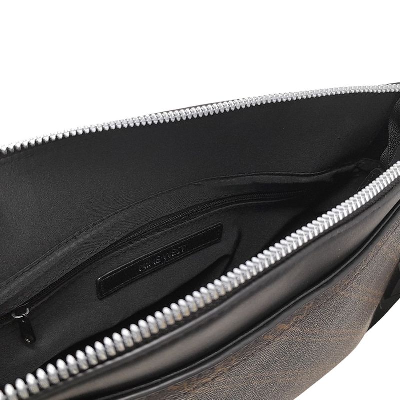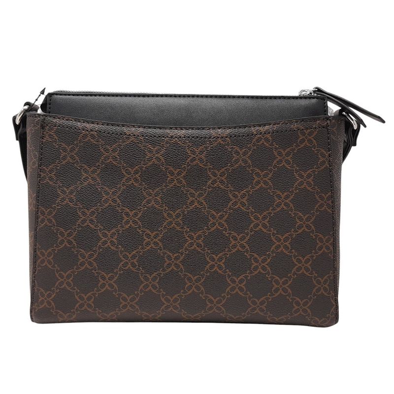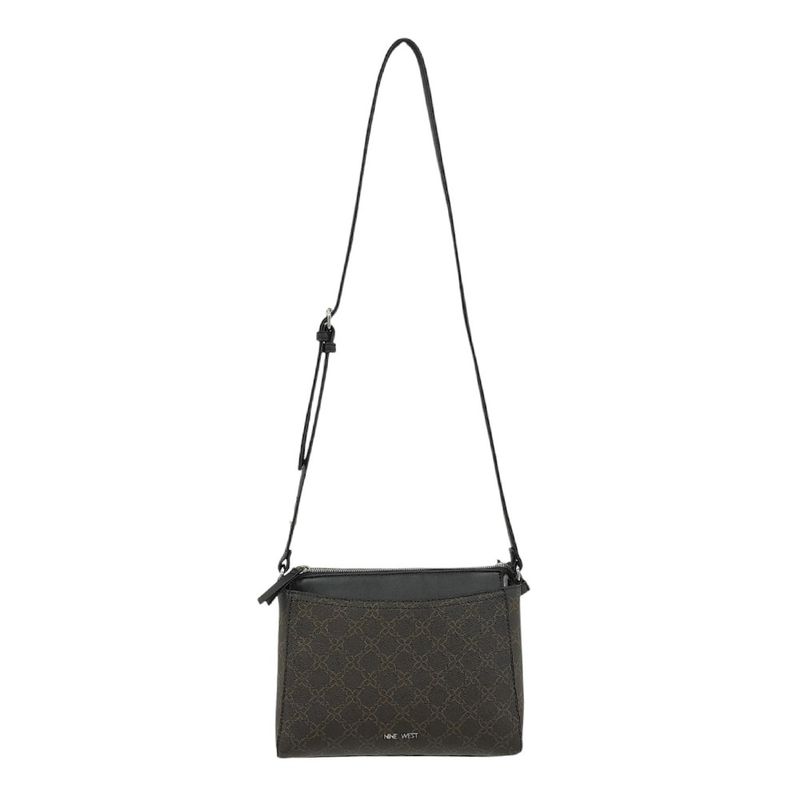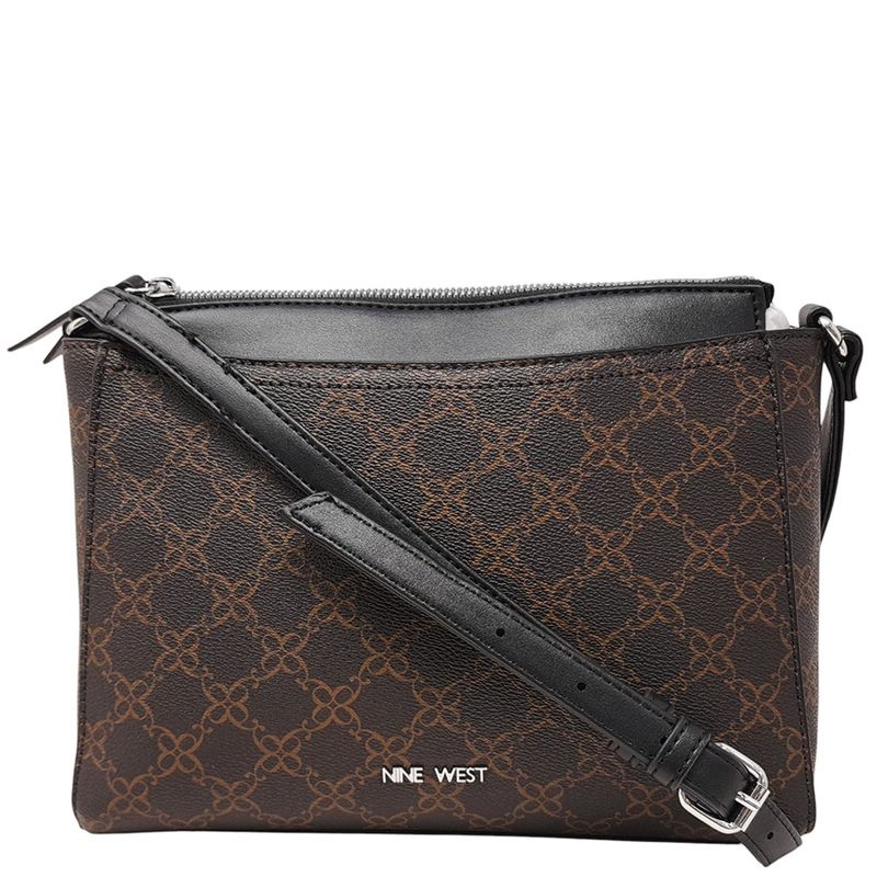 Crossbody con forma cuadrada, su diseño cuenta con una estructura principal estampada en color negro con Monogram de Nine West en líneas café, en su centro cuenta también con detalles de letras metálicas en tono dorado alusivo a la marca.