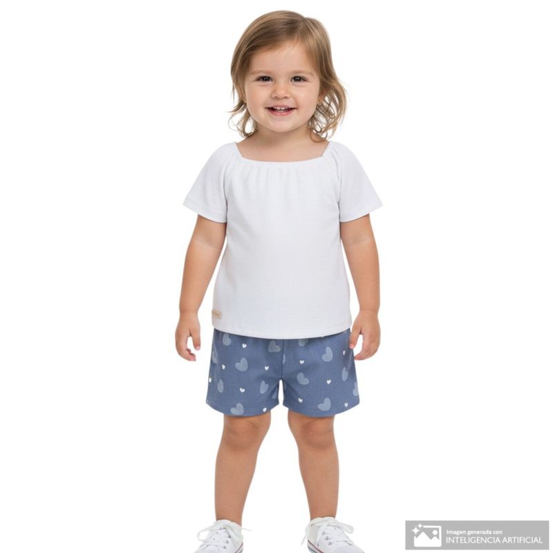Conjunto bicolor para bebé niña ideal para climas cálidos. Incluye blusa blanca de manga corta con cuello cuadrado y short en color azul con estampado de corazones en tonos suaves. Su diseño cómodo permite libertad de movimiento, mientras que la tela suave al tacto brinda confort durante todo el día. Perfecto para uso diario o salidas casuales.