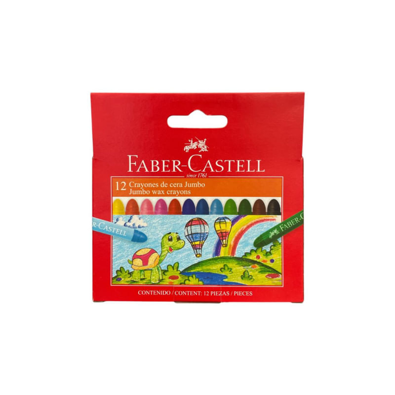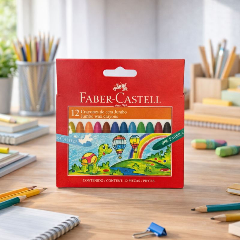 Set de 12 crayones jumbo de cera Faber-Castell, ideales para uso escolar y actividades creativas. Su diseño de tamaño jumbo facilita el agarre, especialmente para niños, permitiendo un trazo más cómodo y uniforme. Ofrecen colores intensos y brillantes que se deslizan suavemente sobre el papel, favoreciendo el desarrollo de la creatividad y la motricidad fina. Están elaborados con materiales de alta calidad, resistentes a la presión y con excelente cobertura. Presentación práctica en estuche compacto, perfecta para el aula o el hogar.