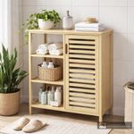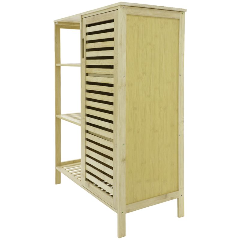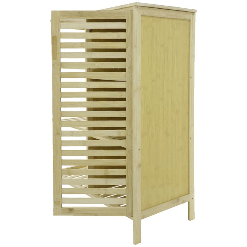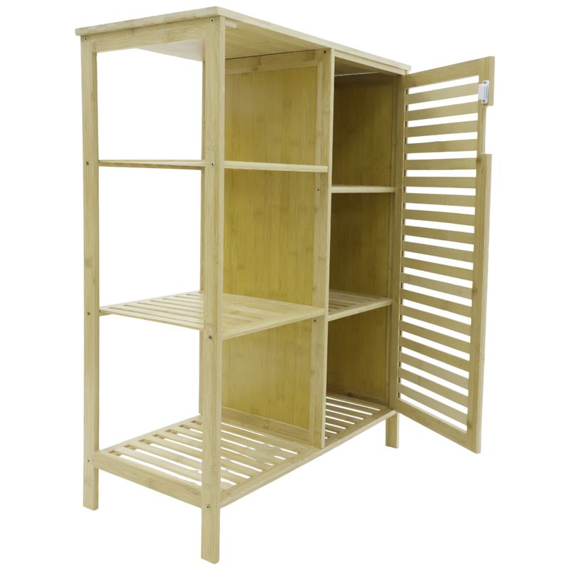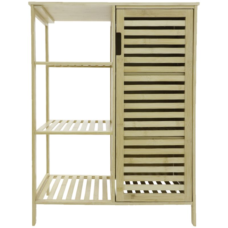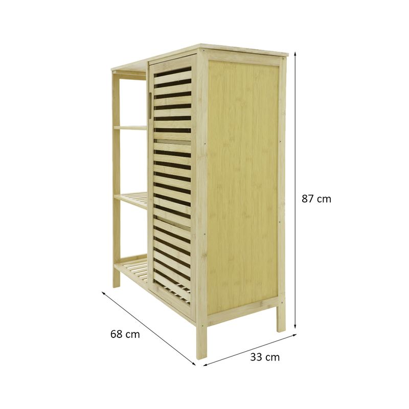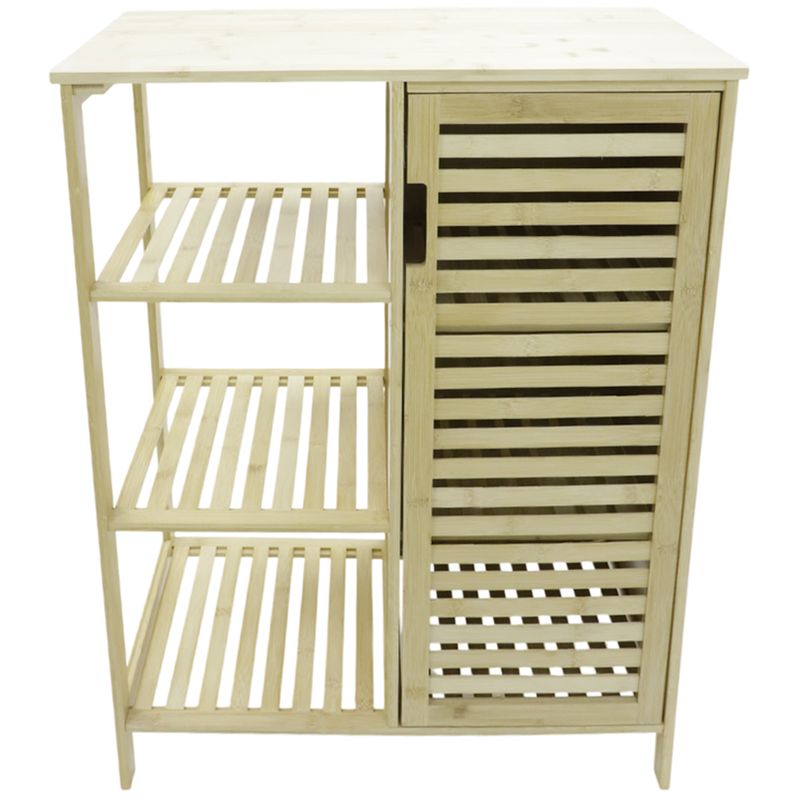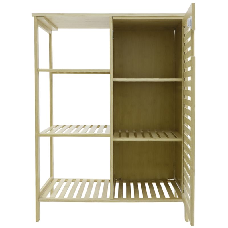 Estante organizador fabricado en bambú con estructura abierta y compartimento lateral con puerta de listones. Cuenta con repisas amplias para almacenamiento en baños, cocinas o áreas de servicio. Ligero, ventilado y resistente a la humedad moderada.