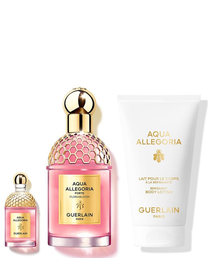 El estuche de regalo Eau De Parfum Aqua Allegoria Forte Florabloom de Guerlain incluye el perfume Aqua Allegoria Forte Florabloom en un formato de 75 ml y una miniatura de 7,5 ml. El perfume presenta un ramillete floral multicolor, con notas de sándalo y musgo. También se incluye una leche corporal a la bergamota de 75 ml, que refleja la vitalidad de las bergamotas de Calabria, Italia. La presentación del estuche es exclusiva, con un diseño inspirado en el Art Nouveau, creado por Mélissandre Vidal.