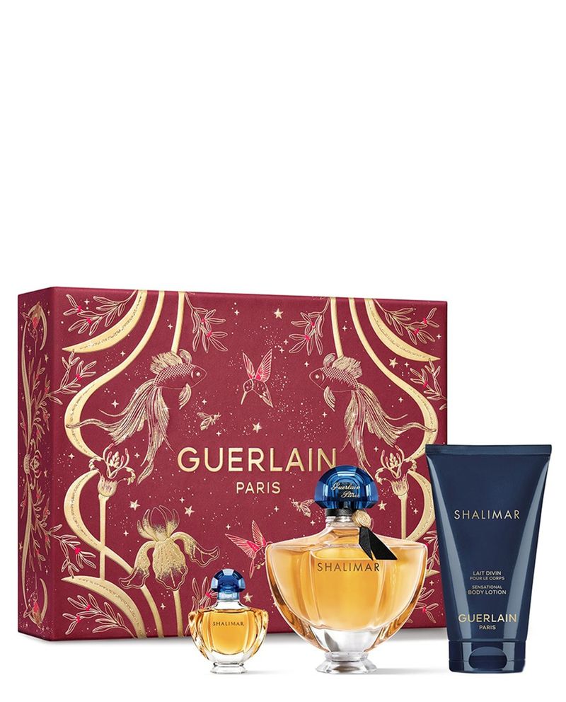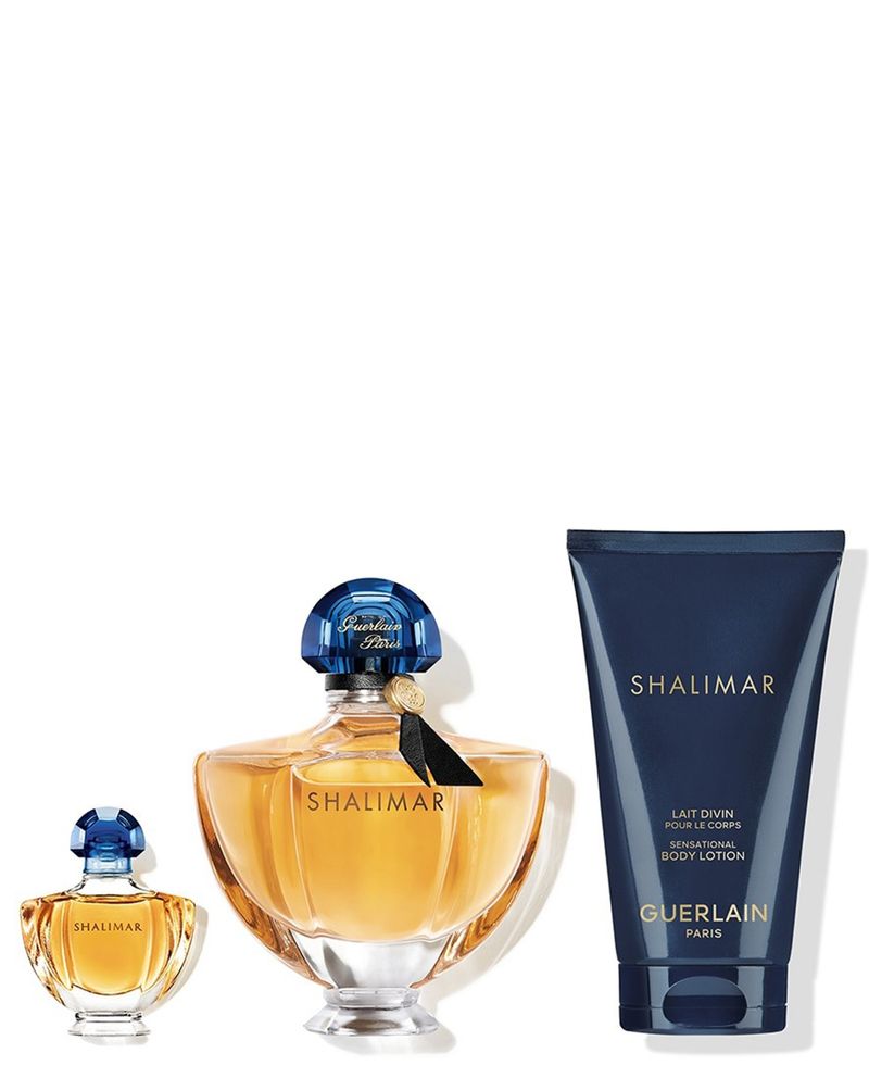 El estuche de regalo Eau de Parfum Shalimar de Guerlain incluye un Eau de Parfum de 50 ml y una miniatura de 5 ml. La fragancia presenta notas de salida frescas de flores y bergamota, un corazón de lirio, jazmín y rosa, y un fondo cálido de vainilla, notas balsámicas y haba tonka. También contiene una loción corporal sensual Shalimar de 75 ml, con una textura fluida y aterciopelada. La presentación del estuche es exclusiva, con un diseño inspirado en el Art Nouveau.