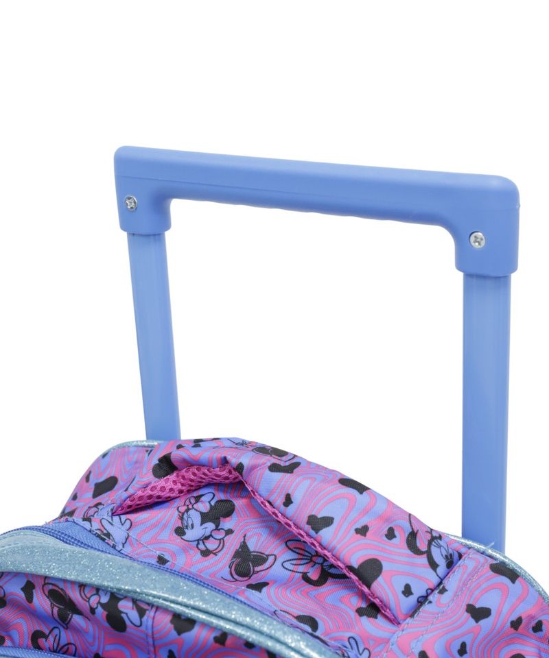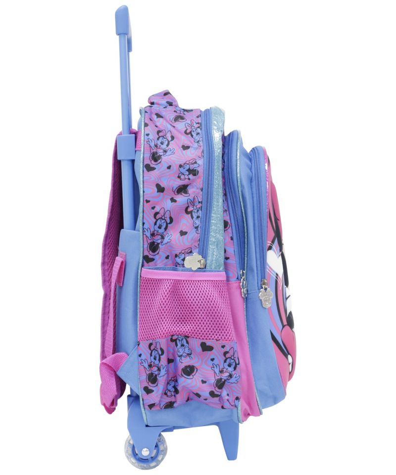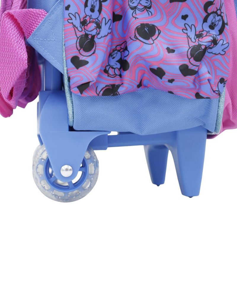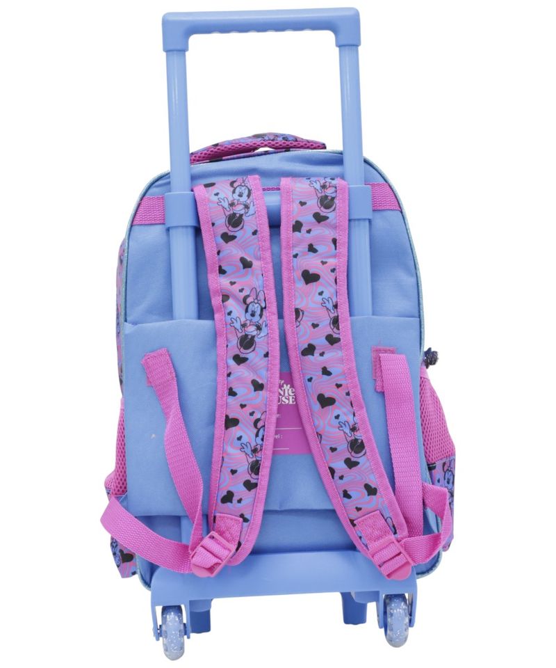 Cuenta con un diseño llamativo y alegre de Minnie Mouse, con combinaciones de colores vibrantes que pueden variar según la disponibilidad en tienda. Su sistema de ruedas facilita el traslado del peso, ayudando a reducir la carga en la espalda y haciendo más cómodo el camino a la escuela o actividades diarias.