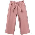Pantalón estilo paper bag para niña, confeccionado en un tejido suave que brinda comodidad y un acabado elegante. Su diseño en color rosado presenta una cintura alta con elástico fruncido y lazo decorativo, que aporta un toque moderno y femenino. El corte recto y suelto ofrece libertad de movimiento, ideal para el uso diario o para looks más arreglados. Perfecto para combinar con blusas, camisetas o suéteres, logrando un estilo versátil y con encanto.