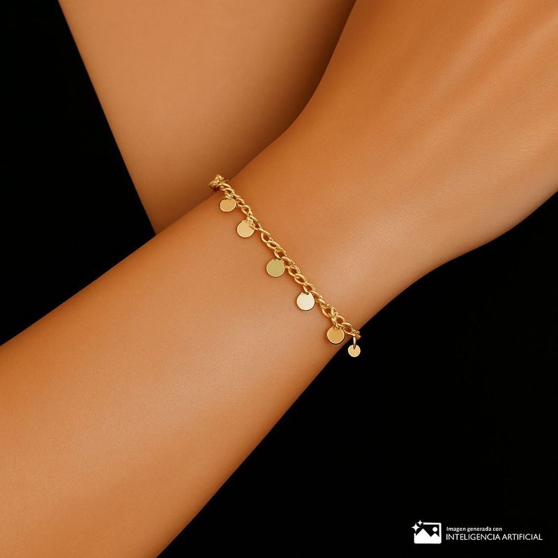 Pulsera femenina elaborada en brass con baño de oro, diseñada con pequeños dijes circulares que añaden movimiento y un toque distintivo. Su estilo delicado y versátil la convierte en un accesorio ideal para usar sola o combinar con otras pulseras.