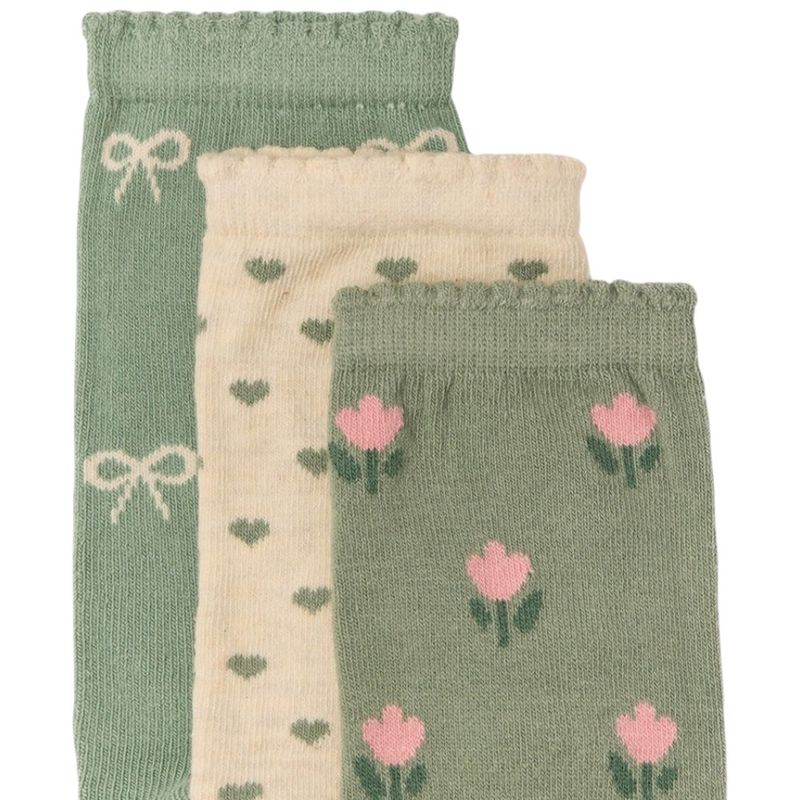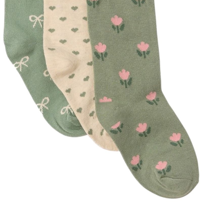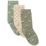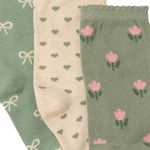 Set de 3 pares de calcetines en tonos verde y rosa claro con detalle de estampado de flores, chongas y corazónes en tonos a contraste. Cuenta con elasticidad en parte superior con detalle de revuelo para un ajuste cómodo. Su diseño suave proporciona comodidad sin limitar el movimiento, ideal para uso diario con un toque tierno y femenino.